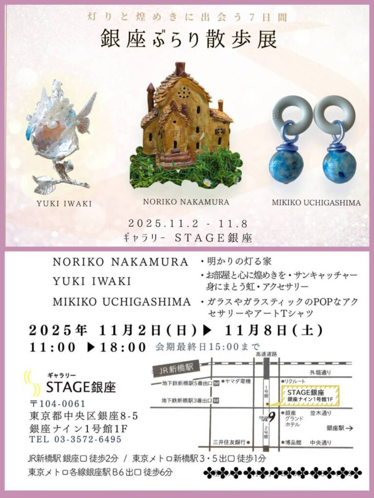 銀座ぶらり散歩展 〜灯りと煌めきに出会う7日間〜 2025.10.11 2024.10.15 開催日程: 2025年11月2日 - 11月8日 開催時間:11〜18時(最終日は15時まで) NORIKO NAKAMURA/ YUKI IWAI/ MIKIKO UCHIGASHIMA